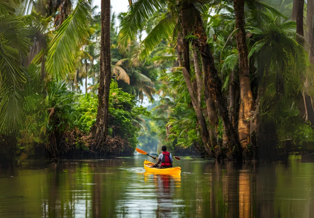 Kayaking through the serene backwaters of Kerala is an adventure of a different kind. It’s not about speed or height but about immersing yourself in the calm and tranquility of nature. Paddling through narrow waterways flanked by lush greenery, traditional villages, and coconut groves offers a unique way to explore Kerala. Alappuzha, also known as the “Venice of the East,” is the best place to experience backwater kayaking, allowing you to connect with the slow, rhythmic pace of rural life.