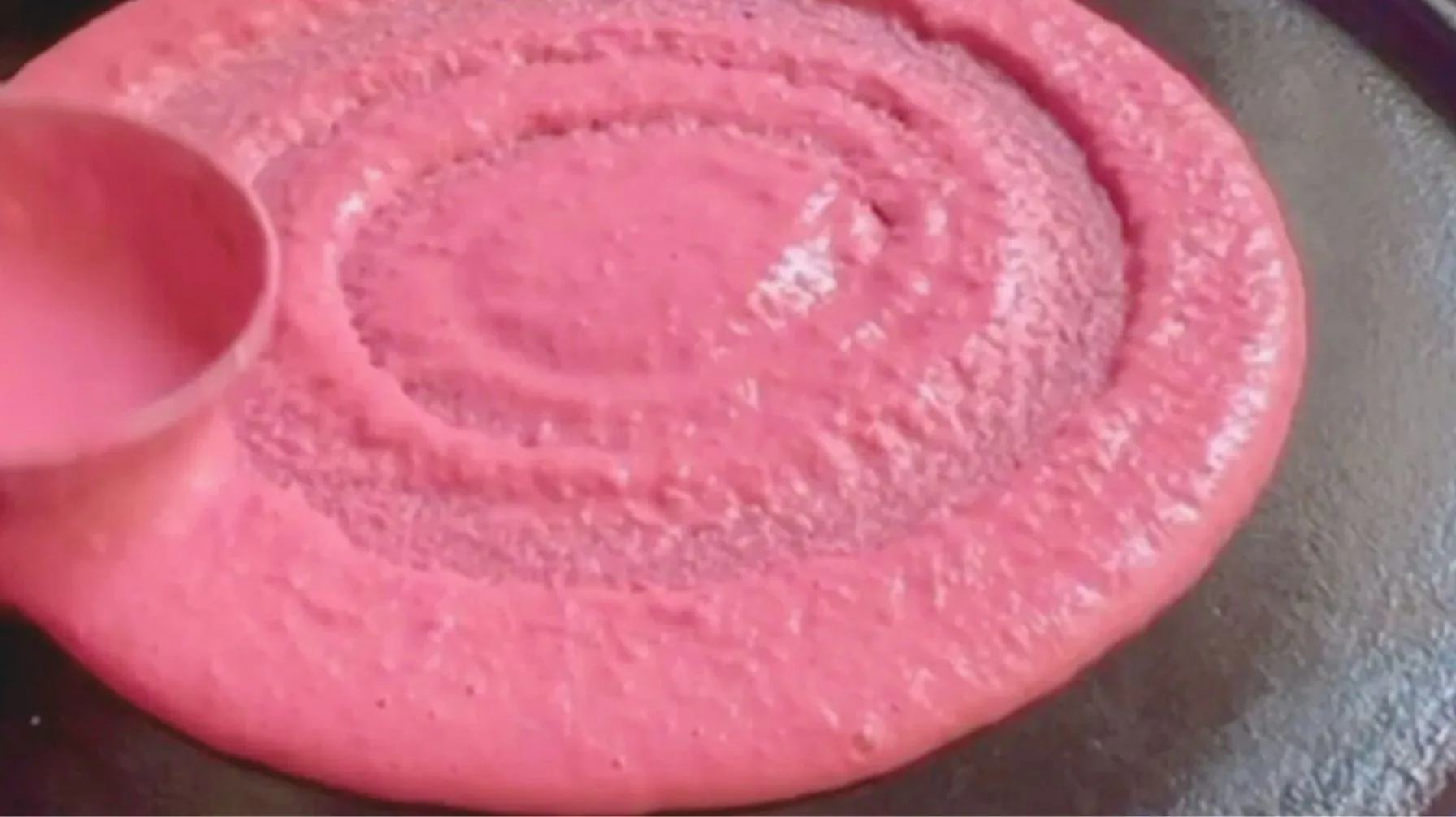 Take your ladle of the batter and pour in the middle of the pan and spread the batter out in a circular movement creating a thin dosa. The batter must be able to spread out and the red beetroot will give the dosa a beautiful reddish colour.