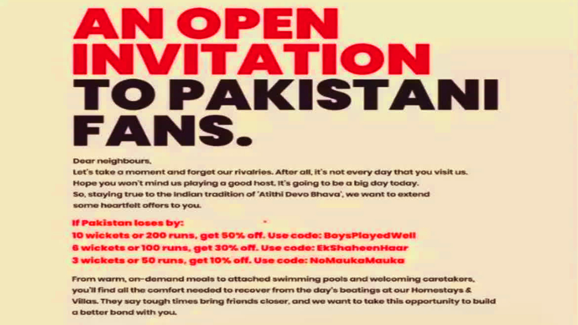 An Indian travel website took advantage of the excitement surrounding the match by inviting Pakistani fans to India and providing them with varying discounts based on their team’s (predicted) losing margins in its tournament promotional campaign prior to the game.