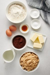 Step 2: Combine the dry ingredients. First, you need to take a mixing bowl to mix all the ingredients, like sugar, flour, cocoa powder, baking soda, baking powder, and salt.