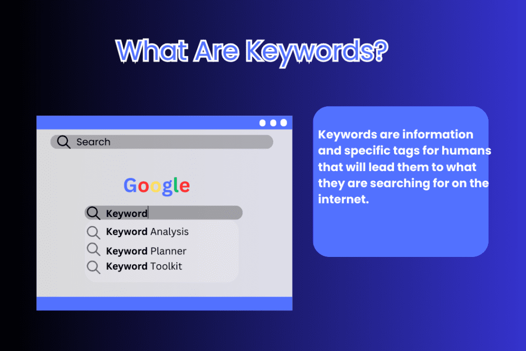 Keywords are information and specific tags for humans that will lead them to what they are searching for on the internet. When you enter a phrase like ‘best video games’ or ‘how to bake cookies’ into a search engine to find information, those are keywords. It is the term for what is searched for, say in a search engine such as Google or Bing.