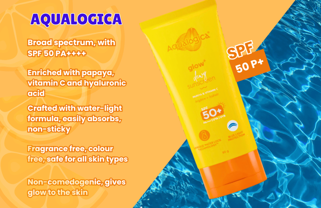 This sunscreen is enriched with the goodness of Papaya, Vitamin C, and Hyaluronic Acid, which provides ample hydration to your skin while imparting a radiant glow. With SPF 50 and PA++++ protection, this non-sticky sunscreen protects against UVA and UVB rays. It has a water-light texture that gives a dewy look without leaving a white cast behind. It’s fragrance-free and colour-free, making it safe for all skin types. Crafted with a water-light formula, the Glow+ Dewy Sunscreen is non-sticky and penetrates easily into the skin after every application. It is non-oily, fragrance-free, colour-free and doesn’t clog pores and gives a glow to the skin. It has a high rating of more than 4.5 stars and retails at the price range of 500-600 and can be found on the official website of Aqualogica or can be purchased through Amazon, Tira, Nykaa.